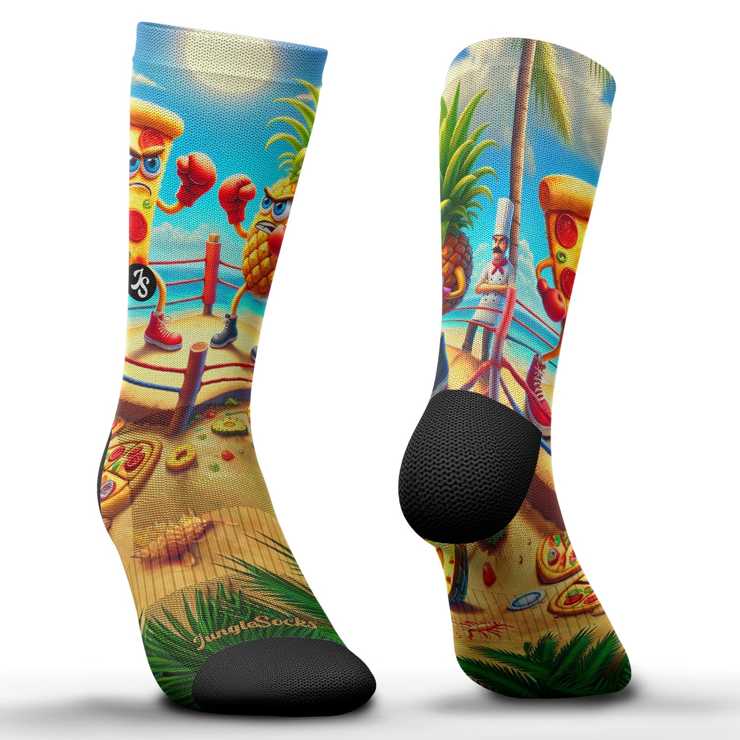 La bataille la plus controversée du monde gastronomique maintenant à vos pieds : Pizza vs. Ananas dans un combat sur la plage pour la suprématie du goût. Ces chaussettes techniques sont le ring parfait pour le combat du siècle, tout en gardant vos pieds prêts pour le prochain round de burpees.